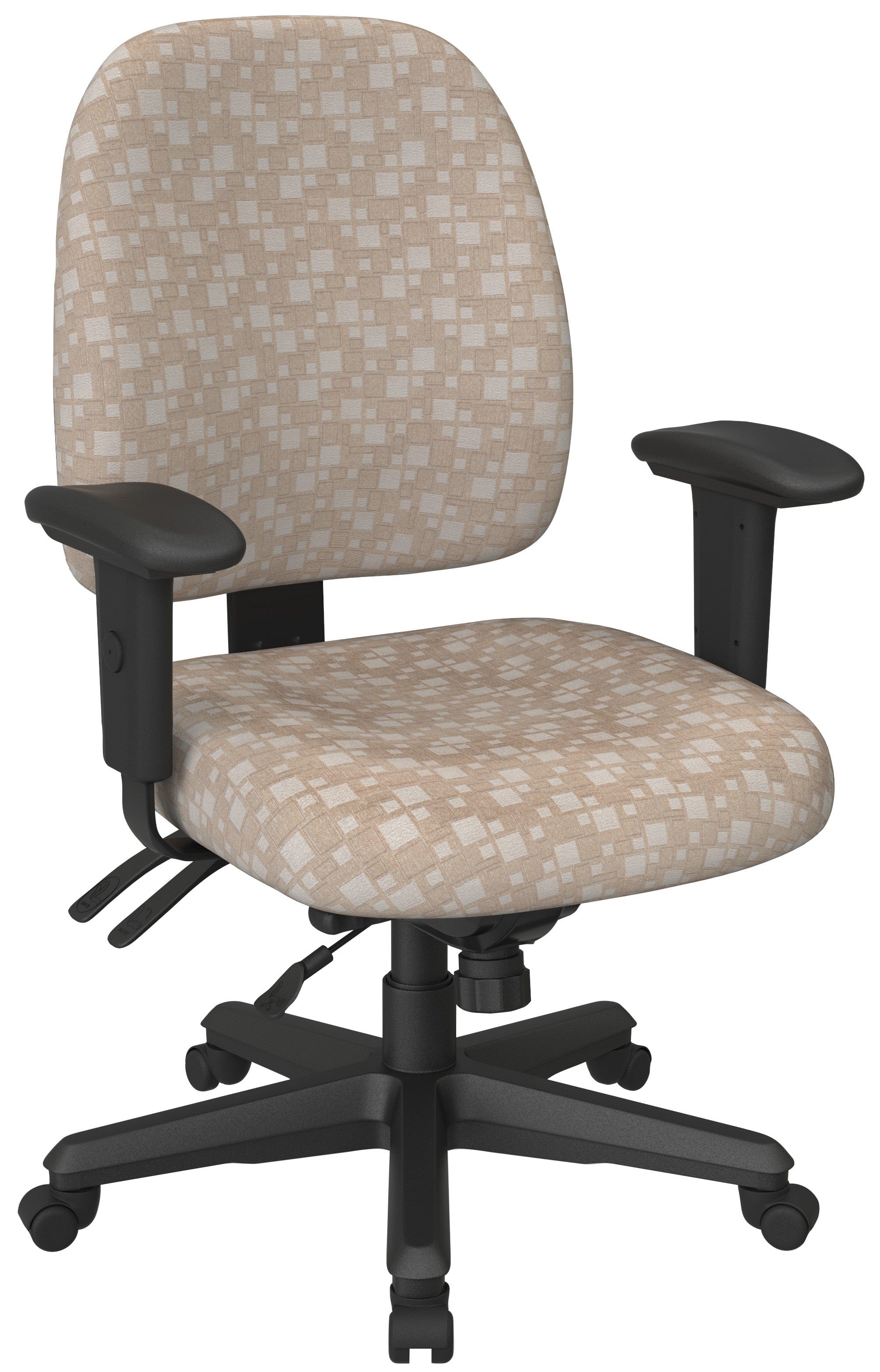 The chair’s height-adjustable "T"-style padded arms provide support for the arms and shoulders, enhancing overall comfort during use. Its robust, heavy-duty nylon base is designed for durability and supports the chair's structure, while the dual-wheel carpet casters facilitate smooth mobility across different flooring types. This combination of features ensures the chair is both functional and tailored for all-day use.