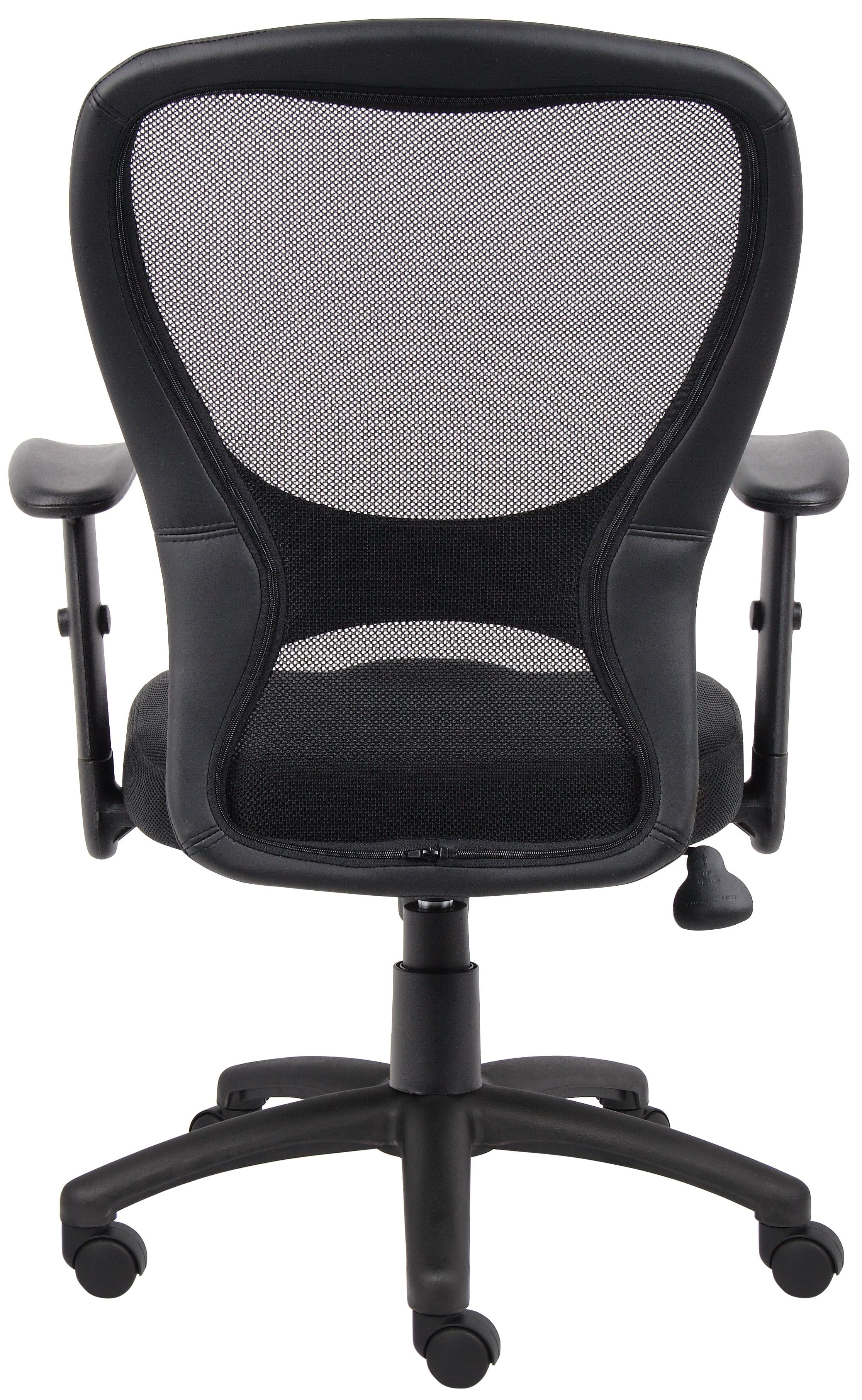 This contemporary mesh office chair from Boss Office Products features a screen mesh backrest that allows maximum airflow to help regulate body heat build-up. Other features include a thickly padded foam filled seat cushion, seat upholstered in durable black mesh fabric, faux leather outer edge trim on the backrest, pneumatic seat height adjustment, 360 degree swivel, tilt with adjustable tilt tension, adjustable height urethane padded arms, and a heavy duty 25" nylon base with dual wheel carpet casters. Meets or exceeds ANSI/BIFMA standards.