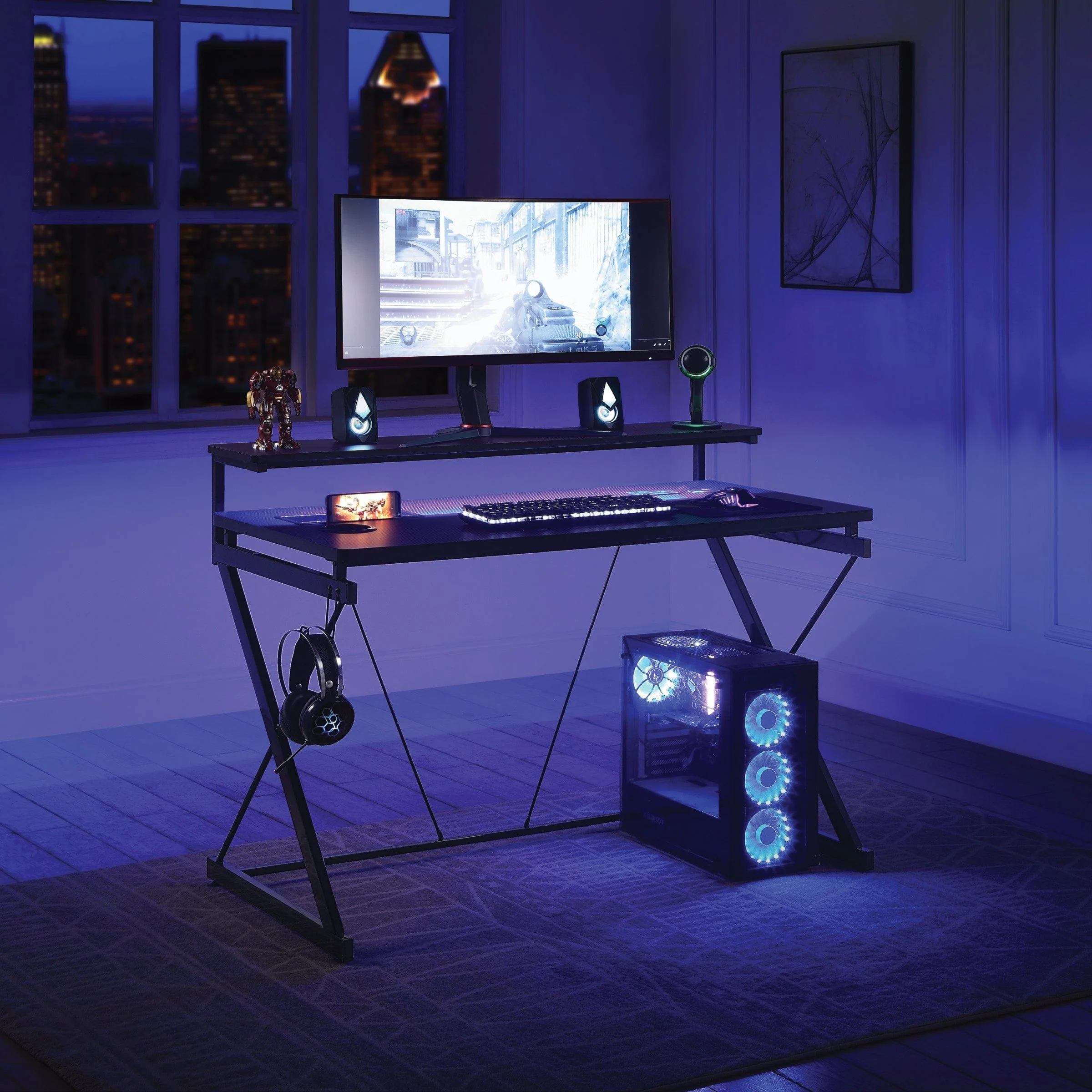 Looking for a perfect gaming desk that can also serve as a casual home office option? The Emulator Battlestation Gaming Desk is here to fulfill your needs. With a built-in power outlet, 2 dual USB charging ports, and a wireless device charging pad, you can now stay powered up while immersing yourself in gaming fun. The desk comes with remote-controlled multi-colored LED lights that optimize the excitement of gameplay. The dual monitor upper shelf positions your monitor at the optimum viewing level, leaving the main 48ā wide desktop area clear for multi-functioning tasks. Additionally, the desk features an accessory hook, flush storage tray, and built-in cup holder, making it the ultimate gaming console.