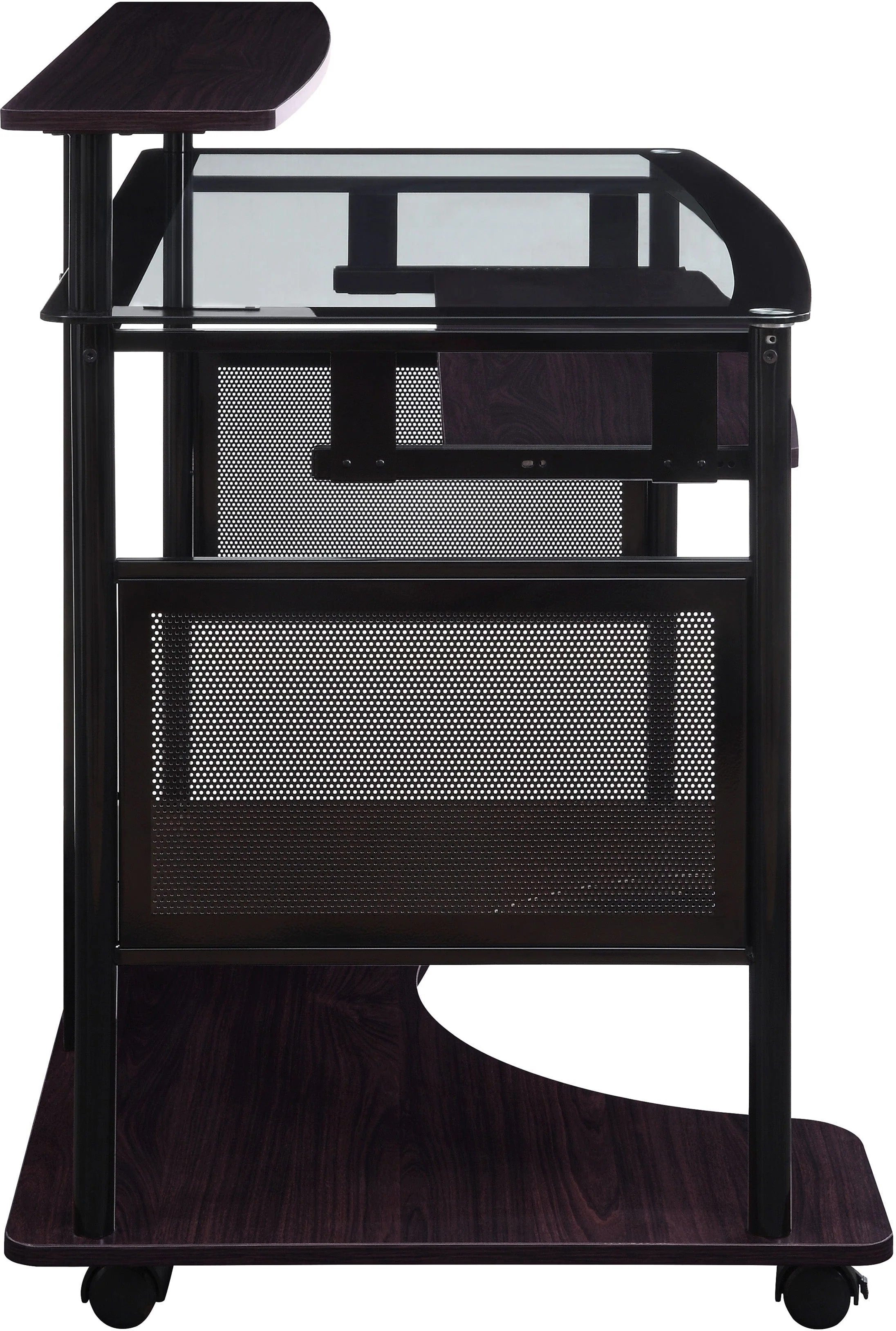 Elevate working from home by upgrading your home office in an effortless style. A clear, tempered safety glass surface with black decorative band and chrome cylinder glass mounts paired with an attractive metal frame provides an airy, open style with loads of workspace potential. Decorative perforated metal privacy screen adds function and visual appeal. The upper glass shelf positions the monitor at the optimum viewing level and keeps the main desktop area clear for multi-functioning tasks. Maintain clean, modern lines by organizing cords and cables with built-in cable management portals. Move and reposition desk smoothly thanks to our heavy-duty locking and carpet casters. Simple, easy-to-follow assembly instructions will get your home office up and running quickly!